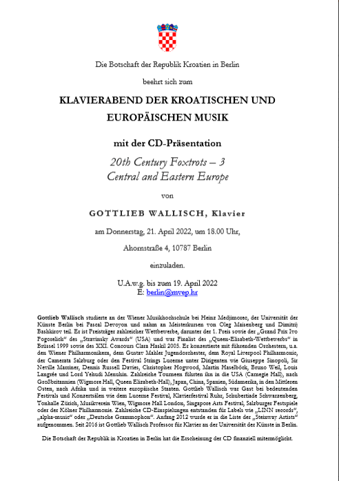 U prostorijama hrvatskog Veleposlanstva u Berlinu u četvrtak, 21. travnja, održat će se klavirski recital pijanista Gottlieba Wallischa.